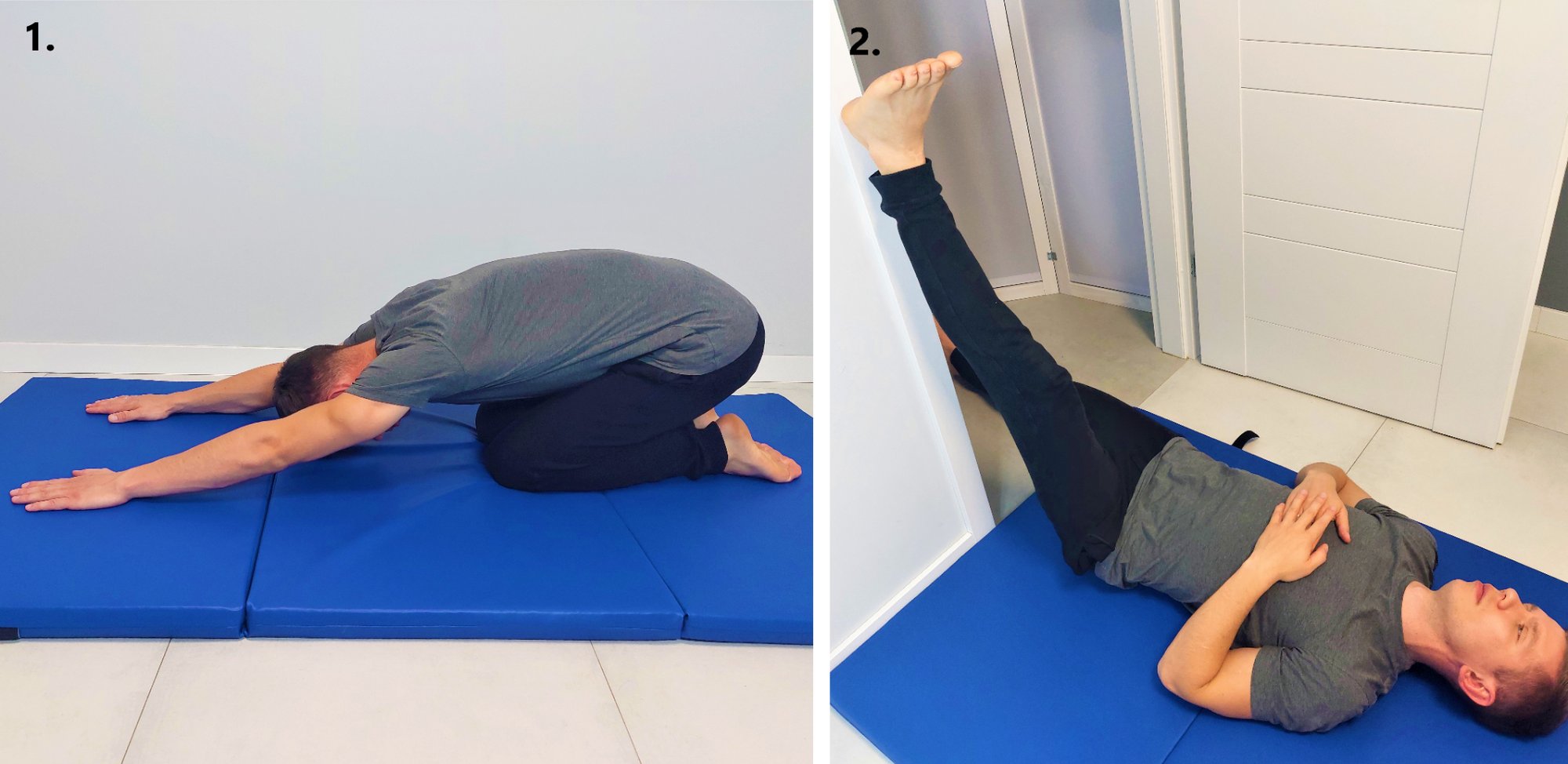 Bardzo korzystna jest pozycja krzesełkowa – leżenie na plecach z nogami ugiętymi w biodrach i kolanach pod kątem 90 stopni, opartymi o krzesło lub poduszkę. Pod odcinek lędźwiowy można podłożyć matę z kolacami.