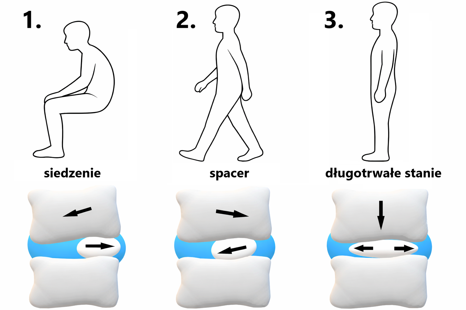 Kręgosłup potrzebuje czasu bez nacisku osiowego. Wieczorem i w nocy krążki międzykręgowe nawadniają się, ponieważ nie są obciążone ciężarem ciała. W ciągu dnia, przez około 16 godzin aktywności, stopniowo się odwadniają.