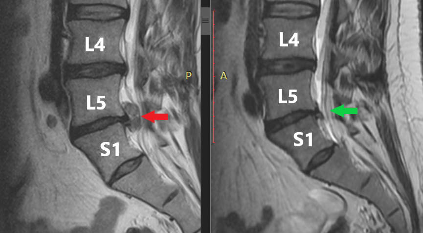 Rycina 1. Pozycycja strzałkowa. Po lewej (czerwona strzałka) przepuklina z istotnym częściowym sekwestrem L5-S1, po prawej (zielona strzałka) znaczna regresja przepukliny L5-S1 i całkowite wchłonięcie sekwestu.