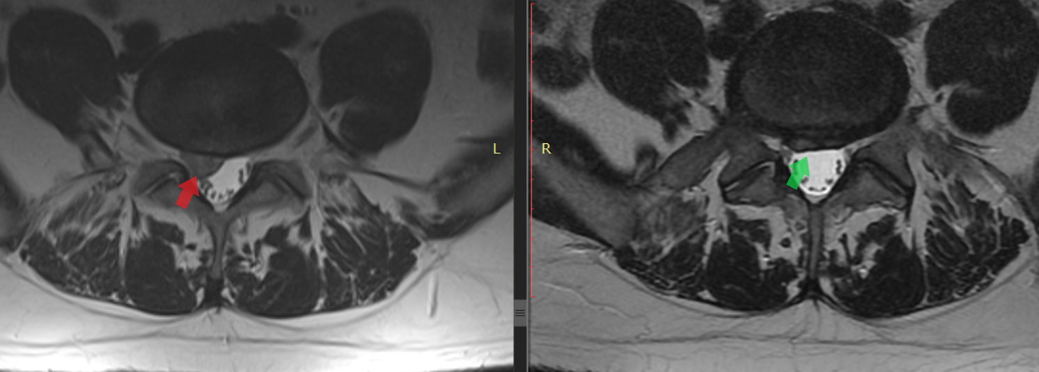 Rycina 2. Przekrój poprzeczny. Po lewej (czerwona strzałka) widoczna przepuklina centralno-prawostronna z istotnym sekwestrem uciskającym struktury nerwowe. Po prawej (zielona strzałka) obraz po rehabilitacji – znaczna regresja przepukliny, swobodna przestrzeń w kanale kręgowym, brak istotnego ucisku.