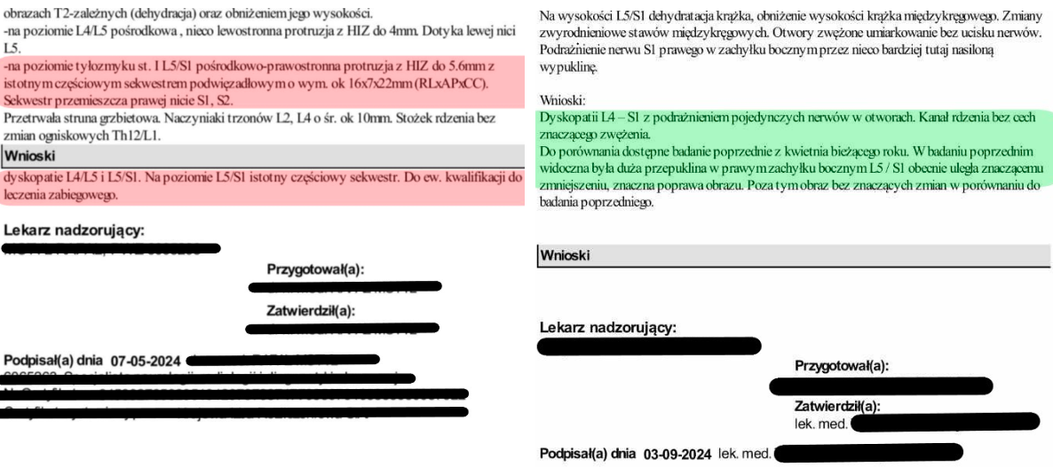 Wielu pacjentów pyta: „czy każda przepuklina kręgosłupa może się sama wchłonąć?”. Odpowiedź brzmi: nie wszystkie, ale bardzo duża część – tak. Poniżej przedstawiam opis rezonansu mojego pacjenta któremu przepuklina i sekwestr uległy wchłonięciu – po lewej stronie znajduje się opis z przed rehabilitacji, a po prawej opis po rehabilitacji.